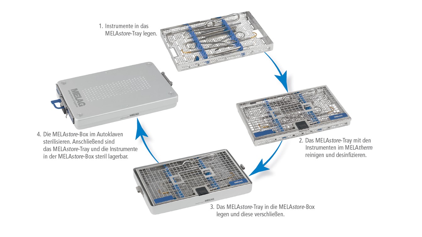 Die Instrumentenaufbereitung mit dem aufeinander abgestimmten System aus MELAstoreTrays und MELAstore-Boxen spart Zeit und Geld: MELAstore ermöglicht einen optimalen Workflow der Instrumentenaufbereitung von der Patientenbehandlung bis zur Lagerung. Die MELAstore-Trays sind aus hochwertigem Edelstahl und sichern durch die großen Öffnungen beste Reinigungsergebnisse im MELAtherm 10. Für die lückenlose Dokumentation der Aufbereitung und der eindeutigen Beschriftung können die MELAstore-Trays mit einem Kennzeichnungsschild versehen werden. Sie ermöglichen eine erhebliche Zeitersparnis bei der Beladung und Entnahme der Instrumente aus MELAtherm 10. Sie tragen zur Qualitätsverbesserung der Aufbereitung bei, indem sie Standardisierung und Dokumentation ermöglichen. Sie bieten Schutz für das Praxisteam vor Verletzungen und schützen gleichzeitig die Instrumente vor Beschädigungen. Sie sind optimal auf MELAtherm 10 abgestimmt. Durch variable Silikonstege wird eine sichere Fixierung der Instrumente ermöglicht.
