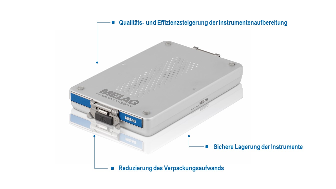 ? Eine deutliche Zeitersparnis bei der Beladung und Entnahme der Instrumente aus dem MELAG Vacuklav ? Reduzierung des Verpackungsaufwands gegenüber der Einzelverpackung von Instrumenten in Sterilisierfolien ? Eine sichere Lagerung der sterilisierten Instrumente ? Eine Qualitätssteigerung der Instrumentenaufbereitung durch Standardisierung und Dokumentation