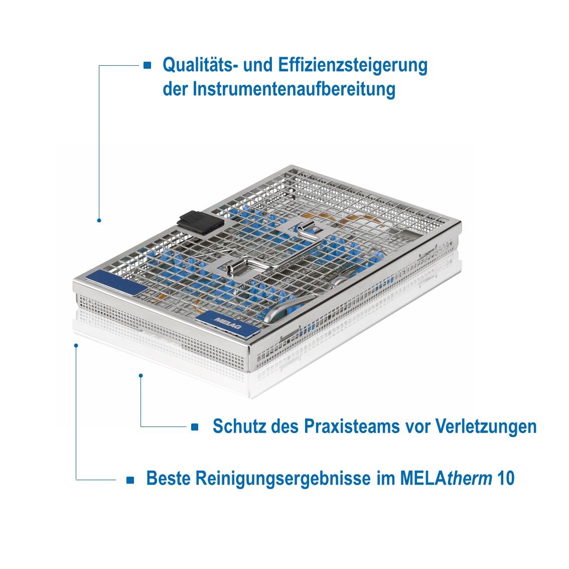 Die Instrumentenaufbereitung mit dem aufeinander abgestimmten System aus MELAstoreTrays und MELAstore-Boxen spart Zeit und Geld: MELAstore ermöglicht einen optimalen Workflow der Instrumentenaufbereitung von der Patientenbehandlung bis zur Lagerung. Die MELAstore-Trays sind aus hochwertigem Edelstahl und sichern durch die großen Öffnungen beste Reinigungsergebnisse im MELAtherm 10. Für die lückenlose Dokumentation der Aufbereitung und der eindeutigen Beschriftung können die MELAstore-Trays mit einem Kennzeichnungsschild versehen werden.