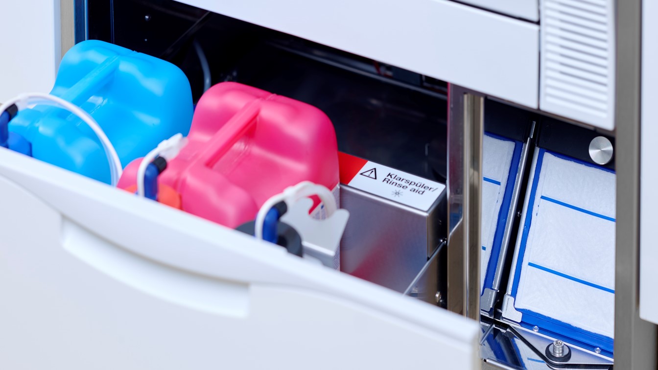 - Integrierte Aufnahme der Prozessmedien und des Dosiermoduls: Integration der Prozessmedien spart wertvollen Platz im Aufbereitungsraum und hilft, Fehler zu vermeiden.