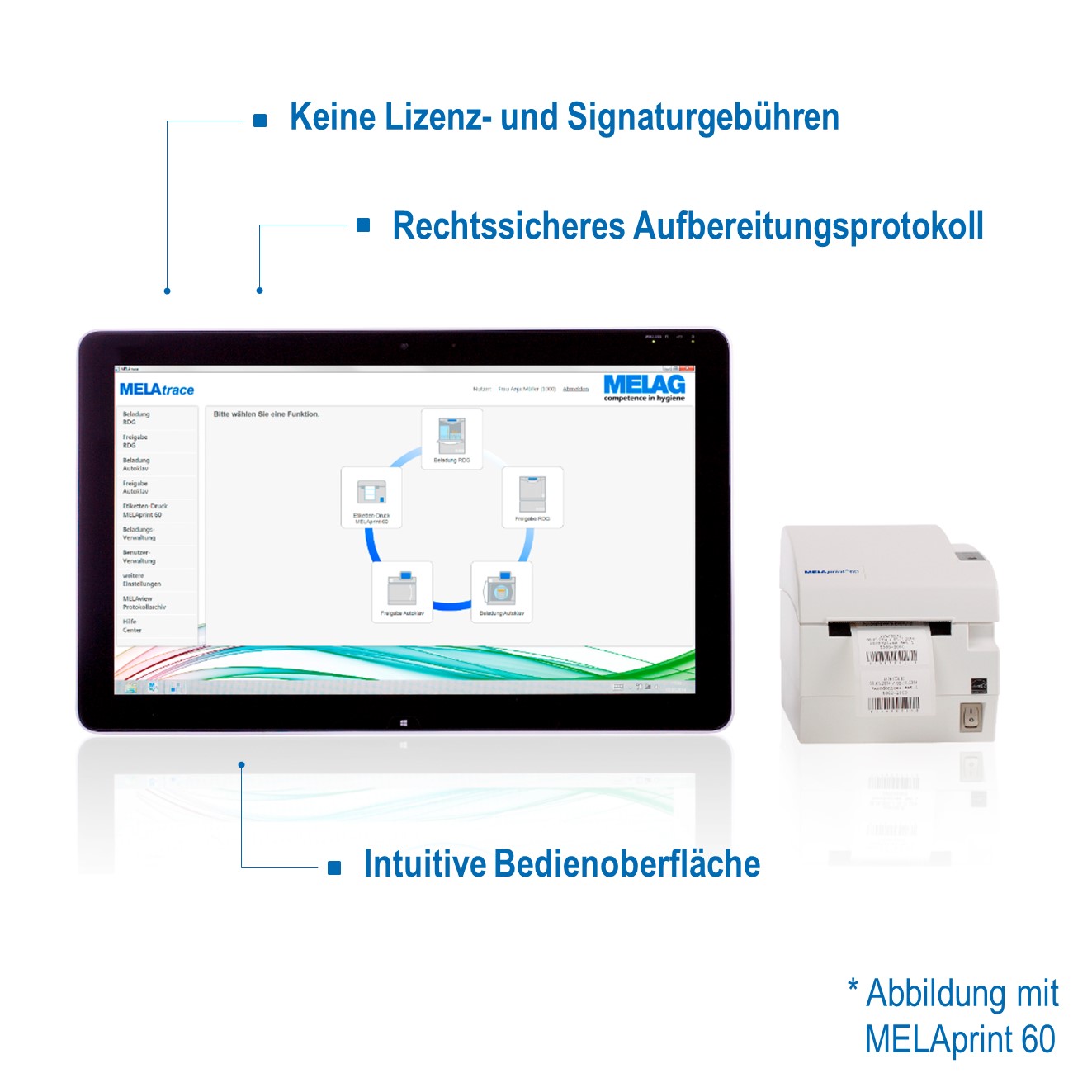 MELAtrace erfüllt die Forderung nach einer vollständigen Dokumentation schnell, sicher und papierlos. Die Bedienung von MELAtrace ist intuitiv und verknüpft die Aufbereitungsschritte der Reinigung und Desinfektion mit der Sterilisation, um eine übergreifende und vollständige Dokumentation der Instrumenten-Aufbereitung sicherzustellen. Mit nur wenigen Klicks erfolgt die Freigabe der Chargen und optional der Druck von Barcode-Etiketten mit MELAprint 60 / 80 zur Kennzeichnung und Rückverfolgung des verpackten Sterilguts. Alle Prozess-Schritte, Programmprotokolle und Freigaben werden vollständig und sicher archiviert: Das von MELAtrace erzeugte Aufbereitungsprotokoll wird als fälschungssichere PDF-Datei gespeichert.