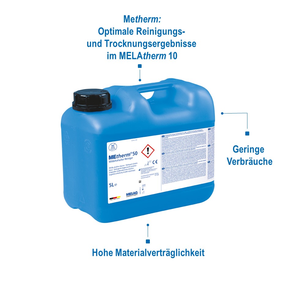 Das MEtherm-Sortiment ist für beste Reinigungs- und Trocknungsergebnisse optimal aufeinander abgestimmt. MEtherm 50 ist ein leistungsstarker mildalkalischer Reiniger, der eigens für die maschinelle Instrumentenaufbereitung im MELAtherm 10 entwickelt wurde. Dabei wird die besondere Reinigungsleistung und die exzellente Materialverträglichkeit durch die Kombination von speziellen Enzymen und Tensiden erreicht. MEtherm 50 ist frei von Silikaten und minimiert dadurch die Entstehung von Belägen auf den Instrumenten und der Waschkammer. Durch die geringe Anwendungskonzentration wird mit MEtherm eine hohe Wirtschaftlichkeit erzielt.
