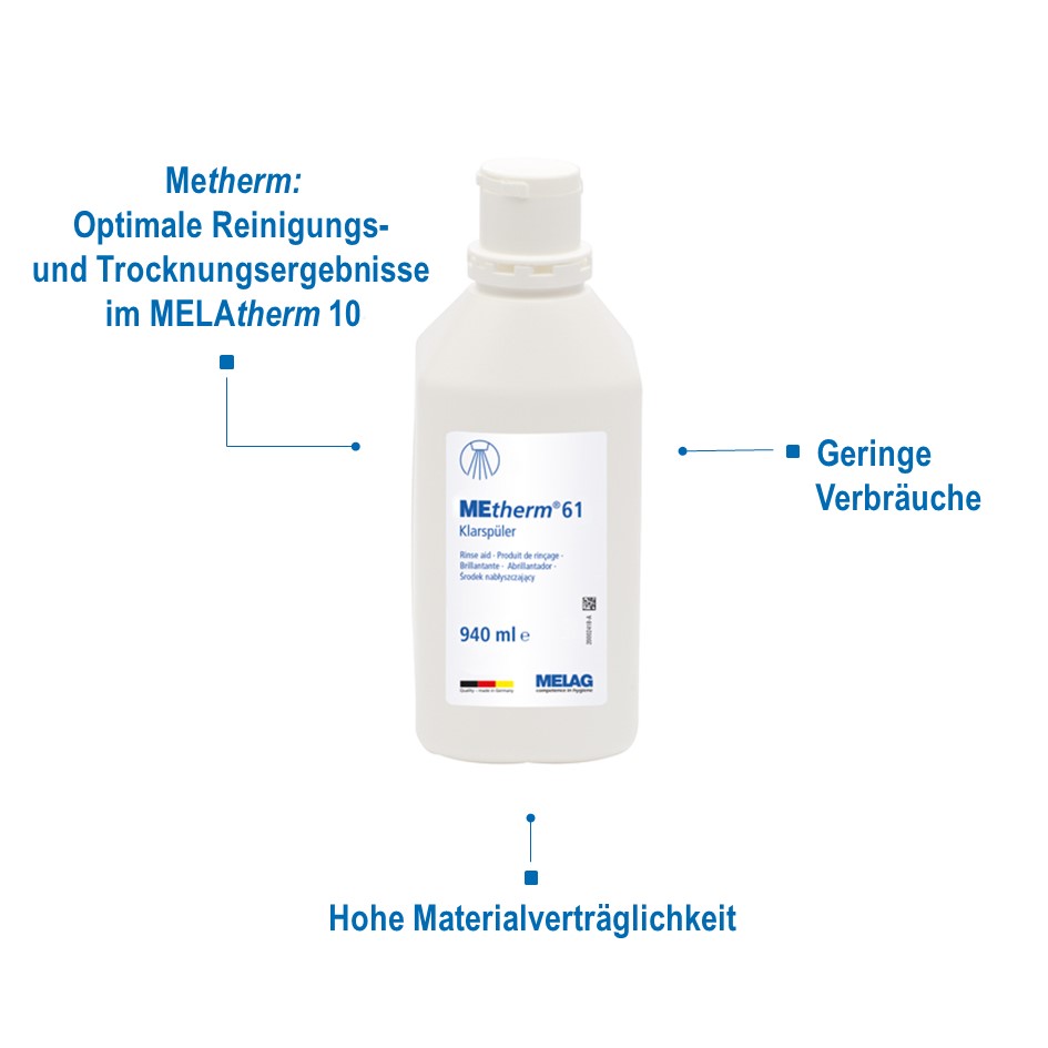 Das MEtherm-Sortiment ist für beste Reinigungs- und Trocknungsergebnisse optimal aufeinander abgestimmt. MEtherm 61 ist ein flüssiger Klarspüler, der eigens für die maschinelle Instrumentenaufbereitung im MELAtherm 10 entwickelt wurde. MEtherm 61 ist pH-neutral und besonders materialverträglich. Neben der Vermeidung von Belagsbildung auf den Instrumenten und in der Waschkammer des MELAtherm 10 trägt die Verwendung von MEtherm 61 zur Trocknungsoptimierung bei.