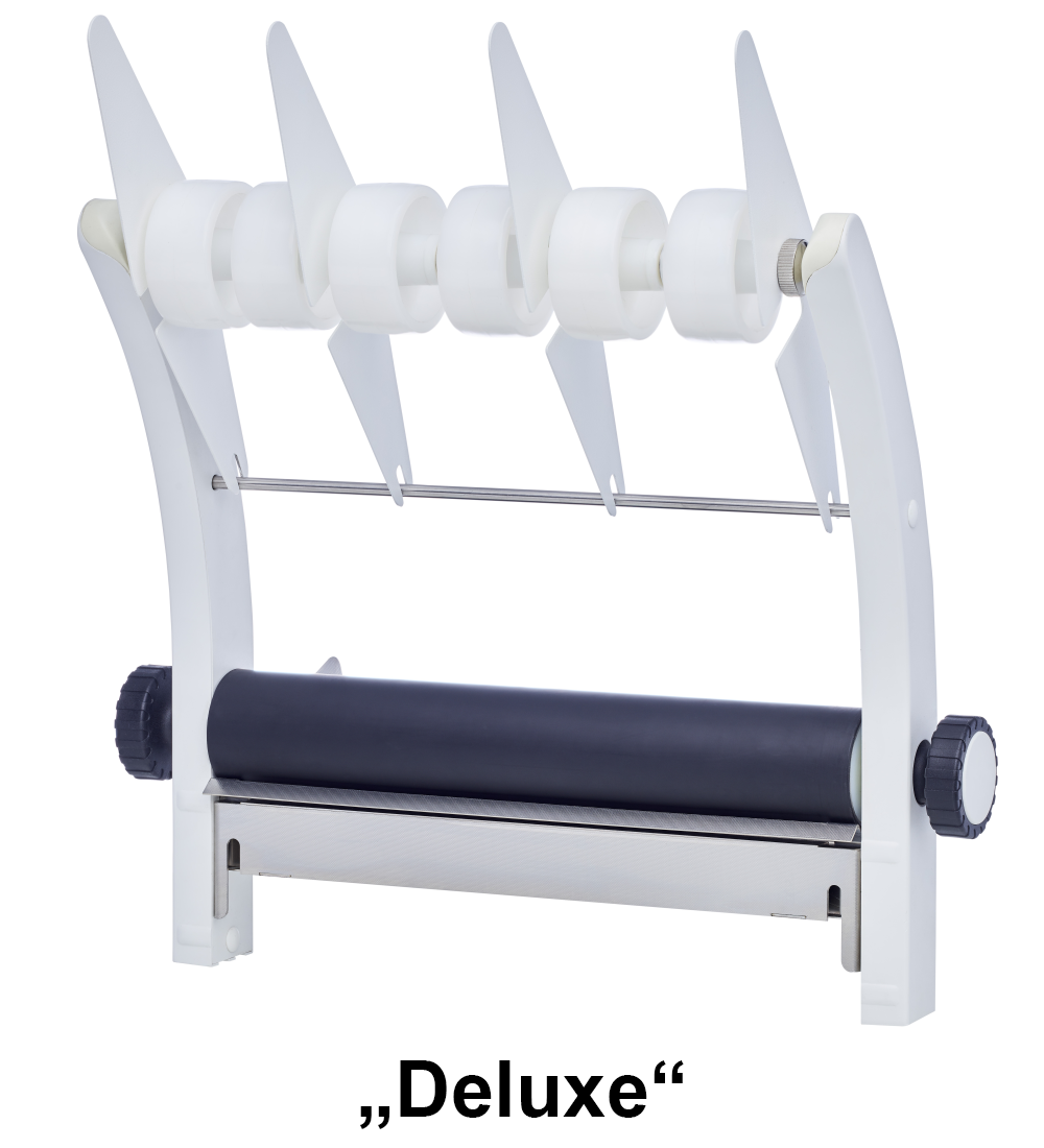 Der Rollenhalter Deluxe" ermöglicht eine platzsparende Aufbewahrung der Folienrollen über dem Siegelgerät. Die integrierte Vorschubeinrichtung, mit einem Handrad ermöglicht ein sehr komfortables Vorschieben der Folie.