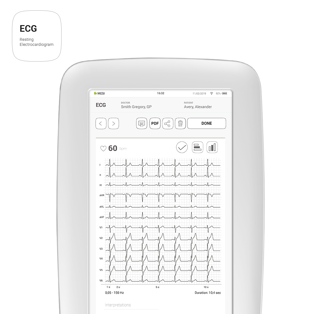 - Das MESI mTablet EKG bietet eine integrierte Interpretationssoftware, die die EKG-Daten analysiert und verständliche Ergebnisse liefert. Dies erleichtert die Diagnose und spart wertvolle Zeit.