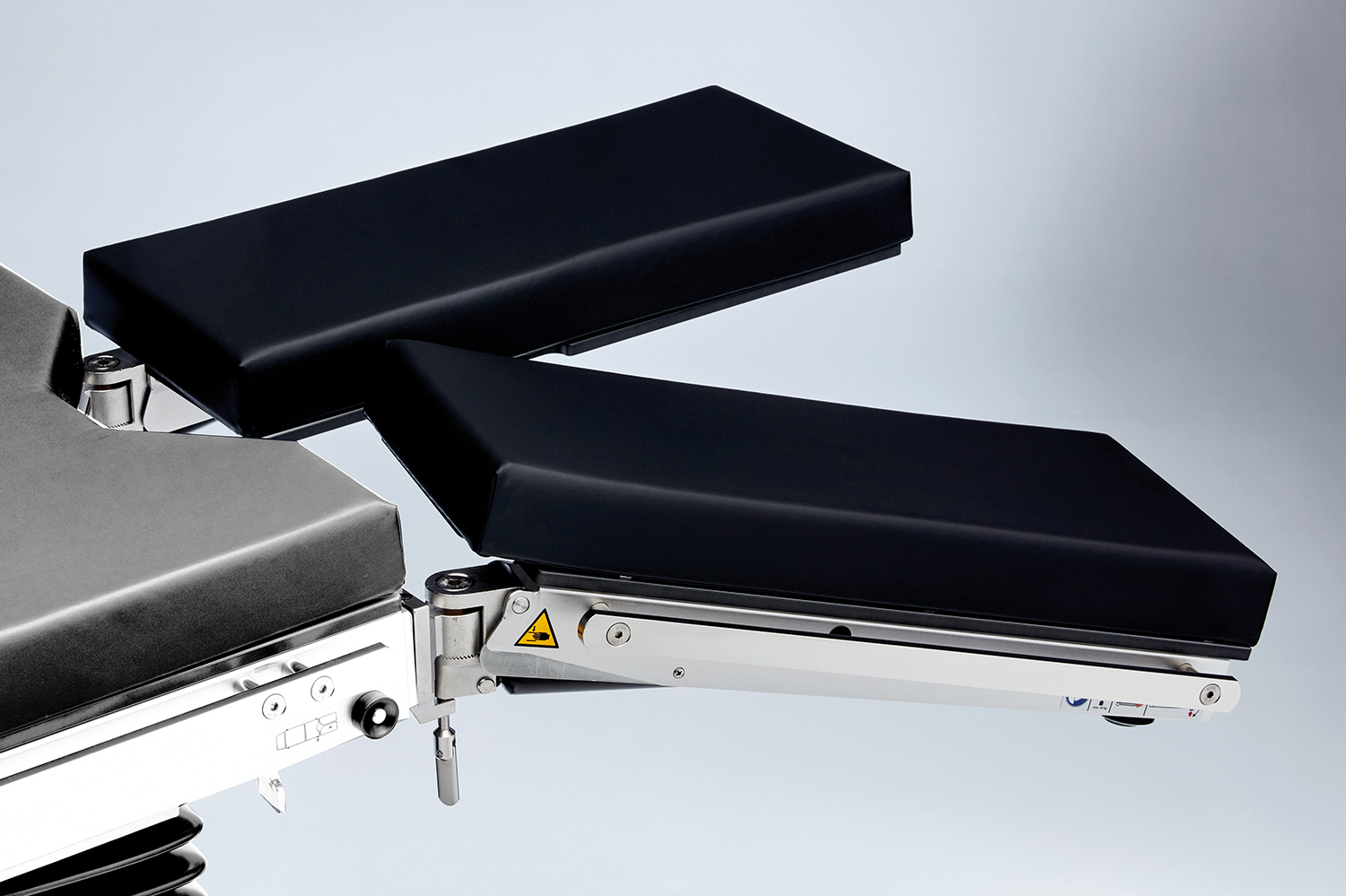 Fußpumpe für Hoch/Tief und Trendelburg/Gegentrendelburg Rückenteilverstellung mit Gasfederunterstützung fahrbar durch 4 Doppelrollen 2 Rollen elektrisch leitend imd zentral feststellbar mit Bodenabdeckung Ohne Kopf- und Beinplatte Serienmäßige Ausstattung: 2-teilige, strahlendurchlässige Lagerungsfläche, bestehend aus: Rückenteil Sitzteil mit Gyn.-Ausschnitt Hydraulische Verstellungen: Hoch/Tief Trendelenburg/Gegentrendelenburg Betätigung über Vorwähleinrichtung mit optischer Anzeige der ausgewählten Funktion am Fußteil. Rückenteilverstellung mit Gasfederunterstützung Integrierter Kassettentunnel SAF-Polsterauflagen, 60 mm stark, elektrisch ableitfähig Tischrahmenkonstruktion aus CNS, gestrahlt und elektropoliert, desinfektionsmittelbeständig. Seitenschienen aus CNS, 25 x 10 mm, an beiden Seiten des Tischoberteils zur Anbringung des Zubehörs, Säule mit CNS-Verkleidung. Fußabdeckung und Bodenwanne aus schlagfestem ABS Fahrwerk mit 4 Doppelrollen mit Abdeckung, davon 2 Rollen elektrisch leitend, zentral feststellbar über Fußpedal, 1 gefederte Richtungsrolle